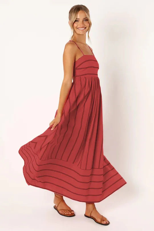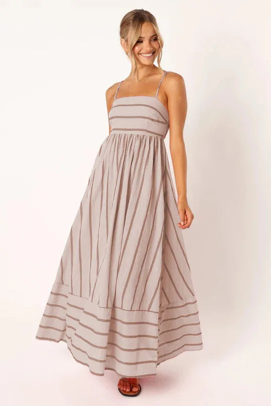 The May Striped Dress is the perfect blend of comfort and style. With its soft pastel stripes and flowy maxi silhouette, this dress radiates summer charm. The delicate spaghetti straps and fitted bodice create a flattering shape, while the gathered skirt adds an airy, relaxed feel. Ideal for beach days, brunch dates, or sunset strolls, pair it with sandals and dainty jewelry for a breezy, chic look.