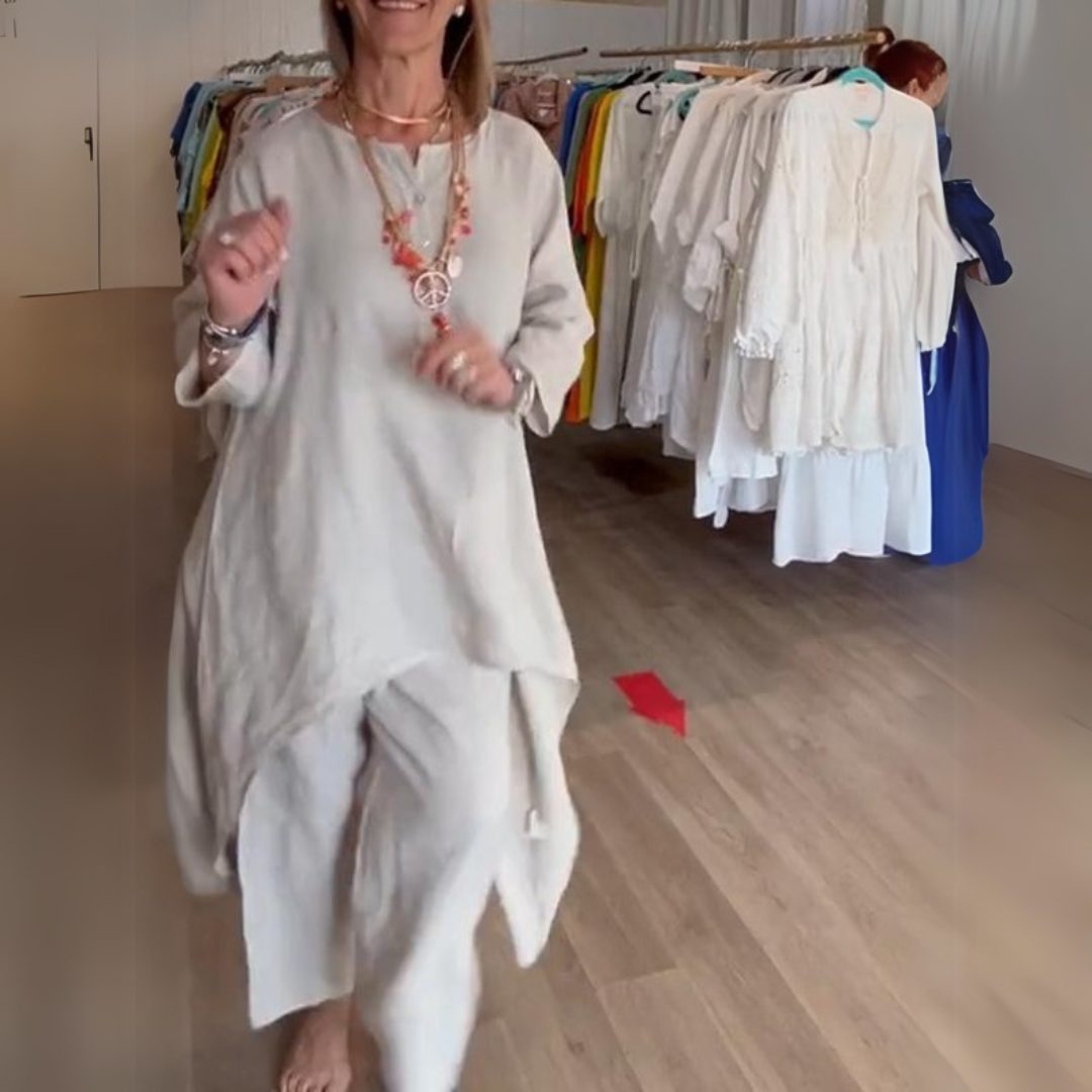 The Misty Lounge Set combines ultimate comfort with versatile style. Crafted from soft, breathable linen fabric, this set includes a flattering tunic and relaxed pants, perfect for lounging at home or running errands. The stylish design ensures you’ll look chic whether you’re spending a day at home or meeting friends for a casual outing. Designed with both comfort and elegance in mind, the Misty Lounge Set is your go-to for relaxed, everyday wear.