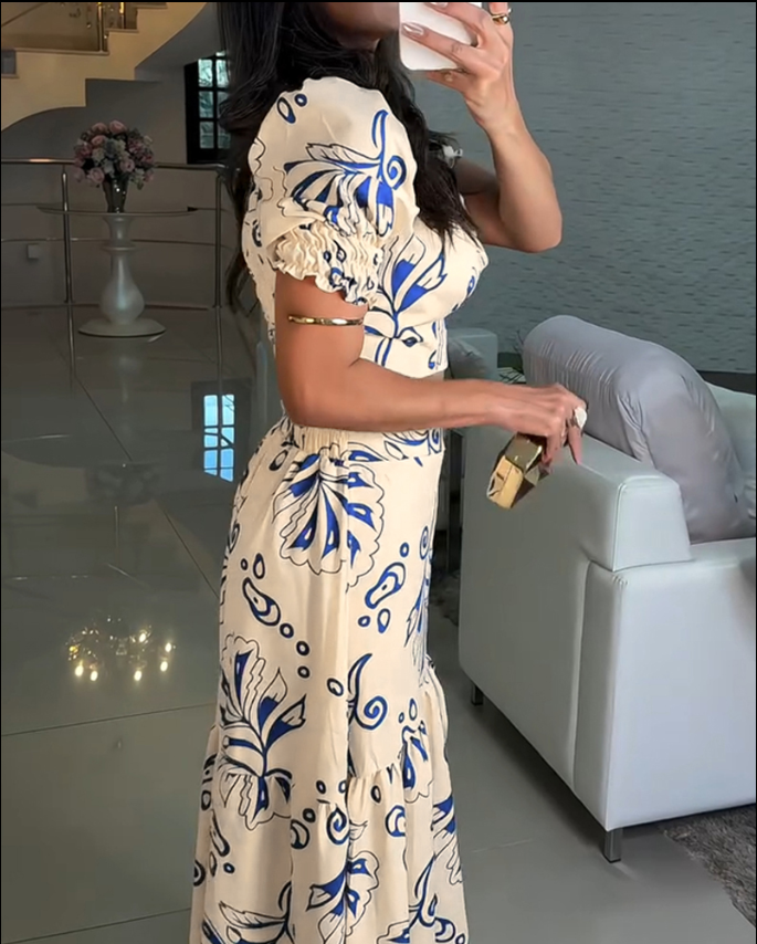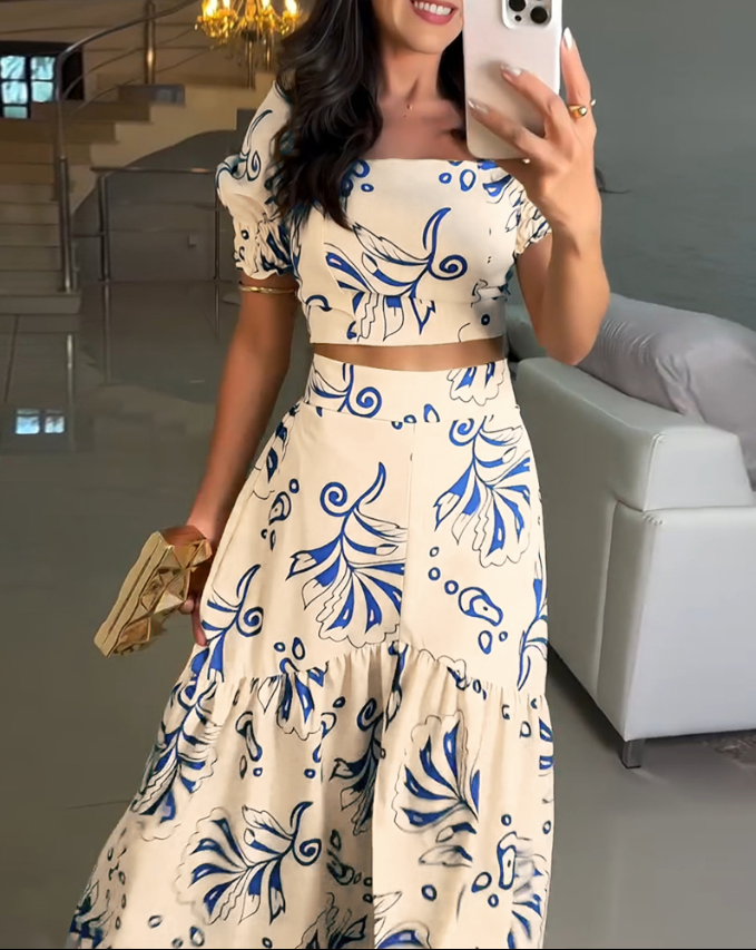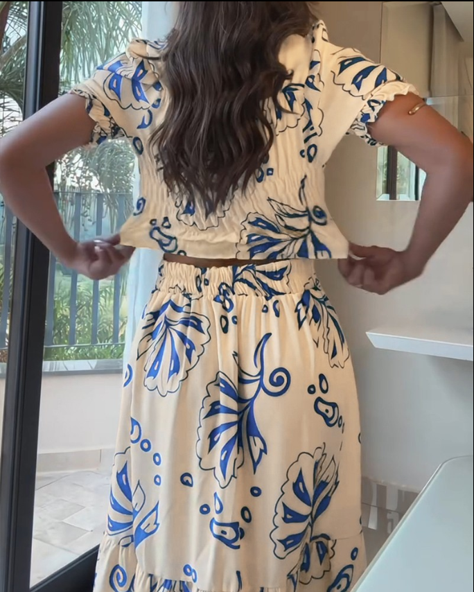 The Lillah Skirt Set was made for sun-drenched afternoons and elegant summer evenings. With its flattering high-waisted skirt and puff-sleeved crop top, this two-piece set creates a silhouette that feels both bold and feminine. The unique navy floral print on soft beige adds an artistic touch, perfect for holidays, dinner parties or summer celebrations. It’s the set you reach for when you want to feel confident, comfortable, and unforgettable.