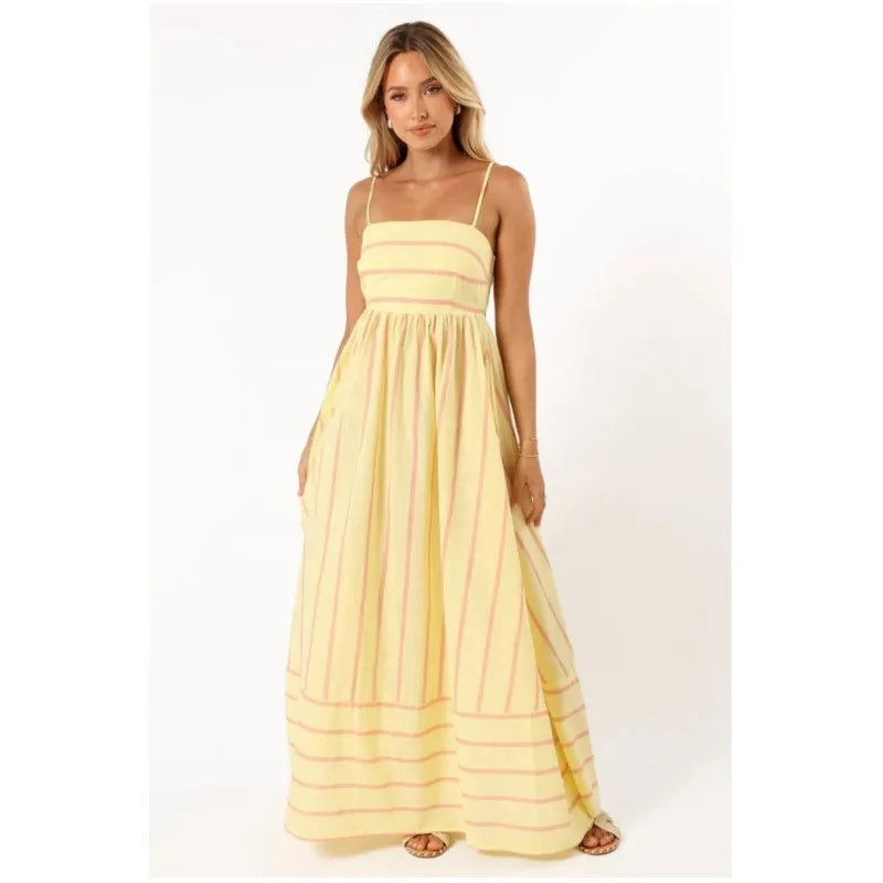 The May Striped Dress is the perfect blend of comfort and style. With its soft pastel stripes and flowy maxi silhouette, this dress radiates summer charm. The delicate spaghetti straps and fitted bodice create a flattering shape, while the gathered skirt adds an airy, relaxed feel. Ideal for beach days, brunch dates, or sunset strolls, pair it with sandals and dainty jewelry for a breezy, chic look.